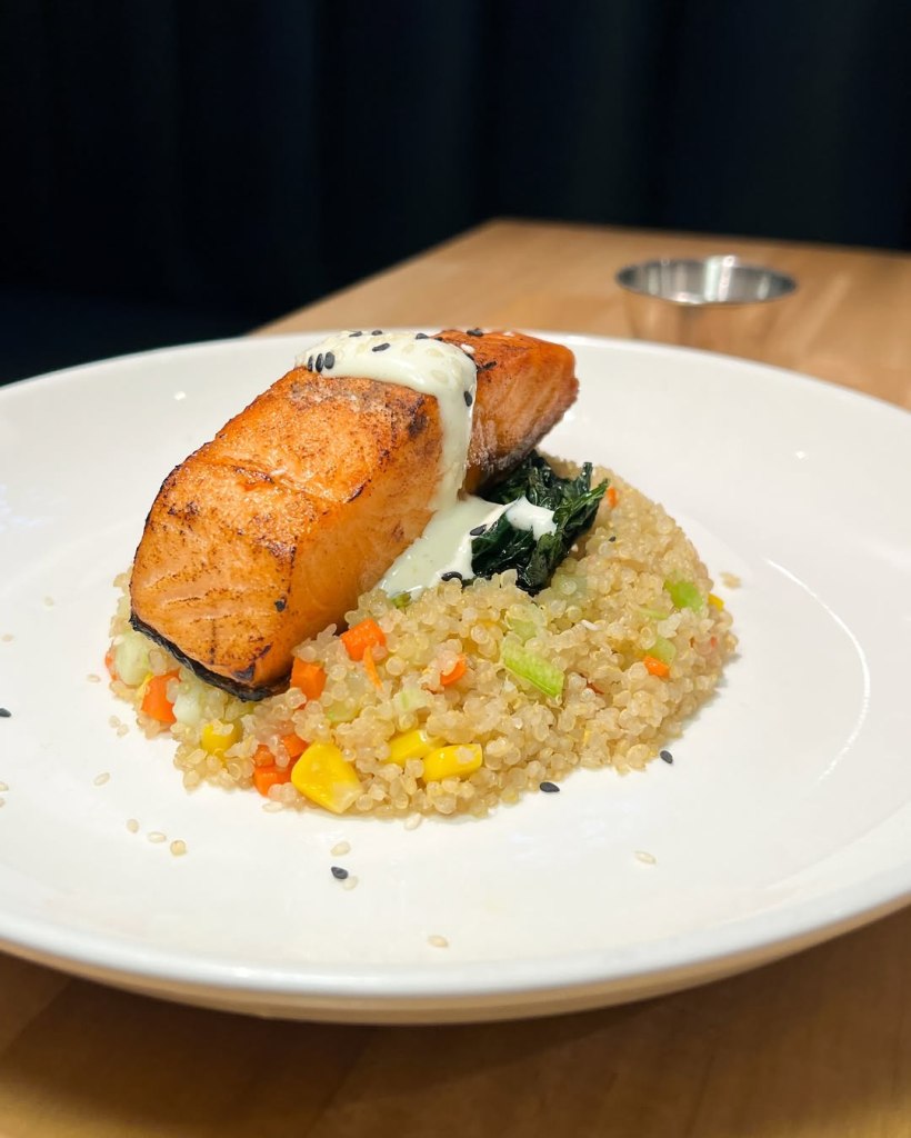 For those seeking a healthy yet delicious option, this dish offers perfectly torched salmon paired with a refreshing quinoa salad. It’s light but full of flavor!